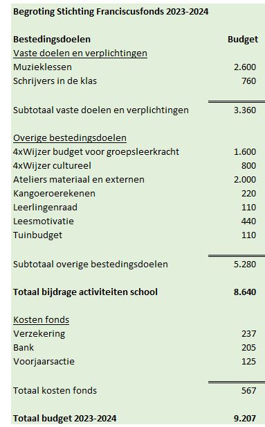 De balans en de begroting wordt met het bestuur van het Franciscusfonds besproken en vastgesteld tijdens de vergaderingen die enkele keren per jaar plaatsvinden. De aanvragen worden gedaan door de school, waarna de bestuursleden de aanvraag door stemming al dan niet in de begroting opnemen.